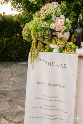 Julia lives and breathes style and decoration details. It was so much fun helping her transform her wedding vision into life. Flowers were a fabulous amount of exquisite white hydrangeas, mixed with more whites and greens. The tablecloths were stone coloured to set off the flowers and decorative fruit. Long tables and thousands of twinkling fairy lights made the dinner area pop. The cocktail zone by the pool had rustic market stands, fabric signs and lots of fruit and flowers. A string quartet played soft modern songs.