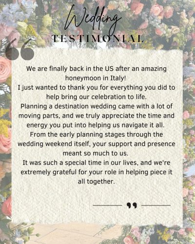 Dinner was incredible.. For us the shrimp and beef were the shining stars and also the mango Thai salad… however everything was outstanding. Our guests have all reached out to let us know how delicious everything was. The music was perfect… my feet were so sore afterwards! The caterer, singer, sax player, DJ – all were brilliant and recommended to us by LWM! The photographer and videographer were excellent too, they listened to everything I asked and directed us well. All the staff who were on the team were great and everyone kept checking in with us all night. Me and Ricci had the best night ever! It was honestly amazing. Thank you for the whole day, it couldn’t have gone any better!