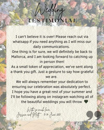Where do we start! Everything we could have imagined and more. Our wedding was named, and I quote ‘wedding of the year’ by our guests. Everything was perfect, we didn’t encounter any problems whatsoever. Our wedding planner Charlotte, we met 2 years prior to our wedding. As soon as we met her we knew she was the one for us. We didn’t look elsewhere. She kept in contact throughout with video calls, emails and WhatsApp which was so reassuring when investing so much time and money into our wedding. From viewing venues to food and drink tasting, she made it feel special for us and was always at the end of the phone if we had any questions. We had an idea of what we wanted, however her expertise and knowledge made us realise how important a wedding planner was to us. She literally covered everything so our day was seamless. I can hand on heart say this woman made our day stand out to other weddings and memorable not only to us but to our guests. Not only did charlotte plan our wedding, she planned our post wedding party. Again this day ran super smoothly and the location was everything we asked her for. I wish I could do it all again but in slow motion as it just went so quick. But as the saying goes, time flies when your having fun! And fun was had by all. Luxury Weddings Mallorca by Magicmed, Charlotte and all your team, hats off to you all as we have the most perfect memories that will last a lifetime. So much love.